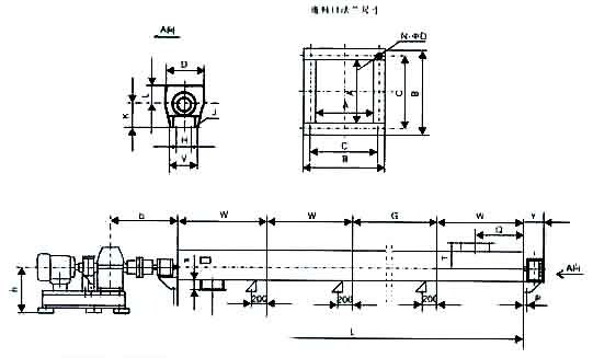 LS型螺旋輸送機等效采用ISO1050-75標準,設計制造符合ZBJ81005.1~2-88《 LS螺旋輸送機》**標準。LS型螺旋輸送機直徑由100mm~1250mm,共十二種規格,分為單驅動和雙驅動兩種形式,單驅動螺旋機長度可達40m(特大型30m),雙驅動螺旋機采用中間斷開軸結構,長度可達80m(特大型60m),螺旋機長度每 0.5m 一檔,可根據需要選定,螺旋機頭部軸承、尾部軸承置于殼體外部減少了灰塵對軸承室的侵入提高了螺旋機關鍵件的使用壽命。中間吊軸承采用滾動、滑動可互換的兩種結構,阻力小、密封性強、耐磨性好。滑動軸承的軸瓦有粉末冶金、尼龍和巴氏合金等多種材料供用戶根據不同的場合選用。吊軸承機外側置式油杯,便于集中加油潤滑。進出料口位置布置靈活,并增設電動型出料口,便于自動控制,還可根據用戶要求,配置測速報警裝置。